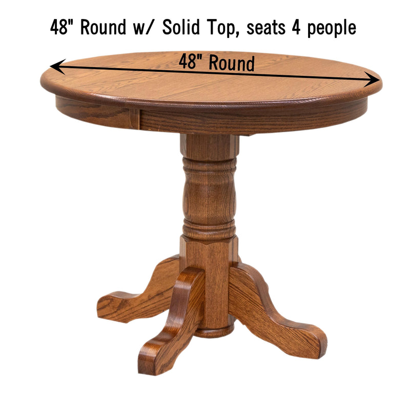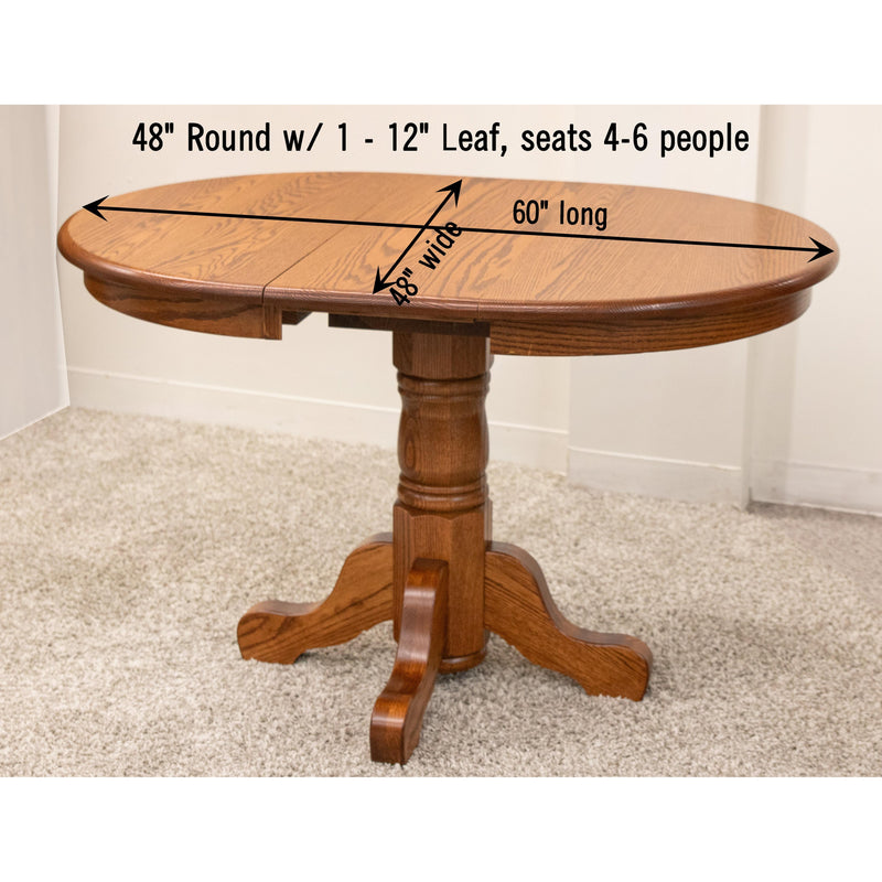 The Traditional Round Dining Table is a sturdy, classic style table. The Amish made table can be ordered with an optional 12" hinged leaf that folds in half for storage. It can be ordered in your choice of wood and color. For more details, contact a member of our team.