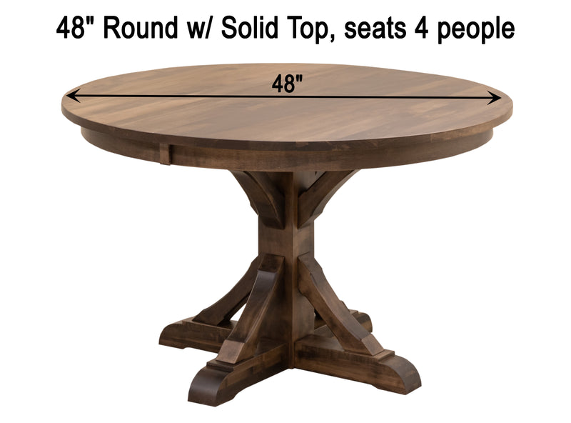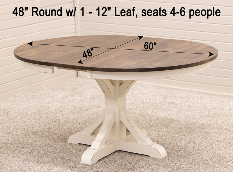 The Newport Round Dining Table is built with solid wood and can be ordered with an optional 12" hinged leaf that folds in half for storage. The Amish-made table can be ordered in your choice of wood and color. For more information, contact a member of our team.