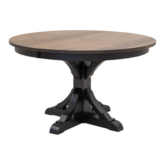 The Newport Round Dining Table is built with solid wood and can be ordered with an optional 12" hinged leaf that folds in half for storage. The Amish-made table can be ordered in your choice of wood and color. For more information, contact a member of our team.