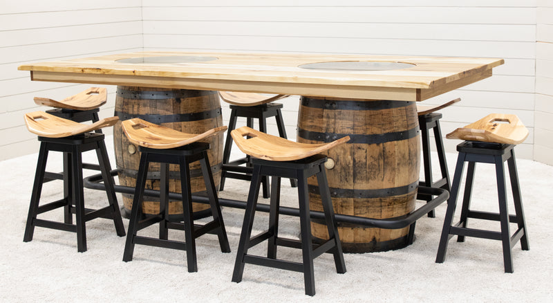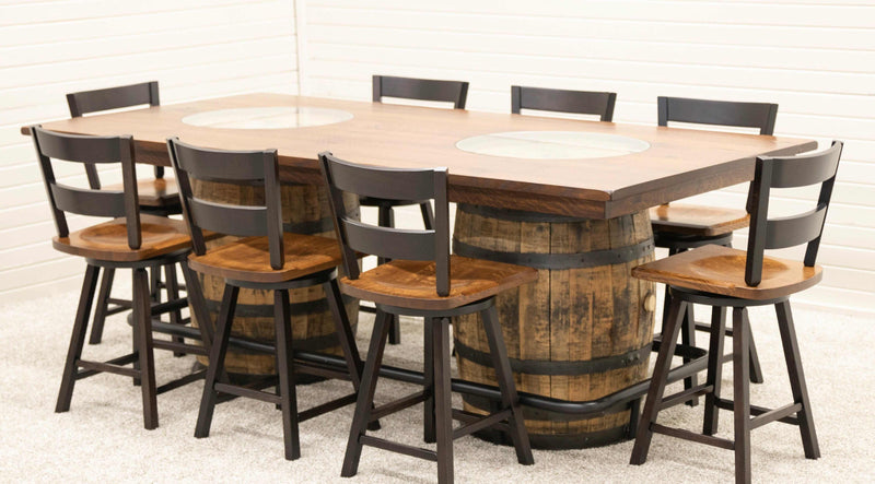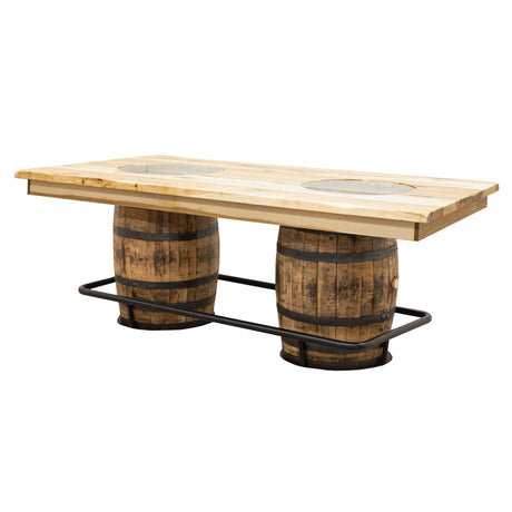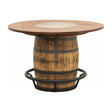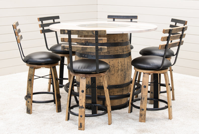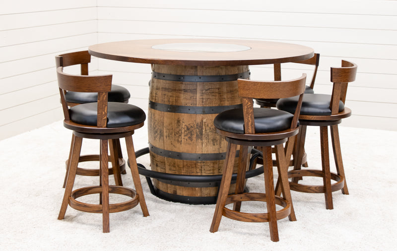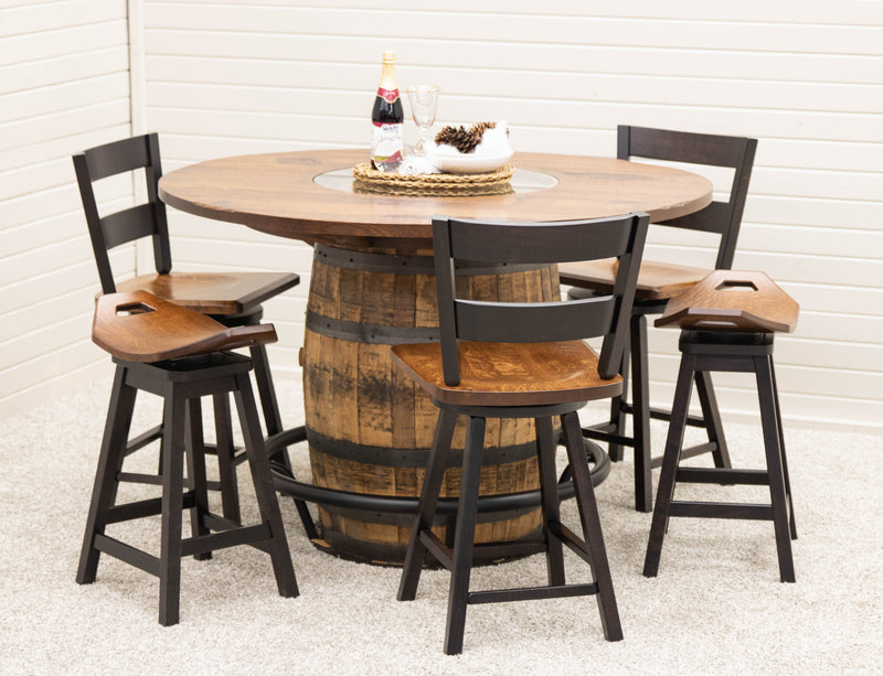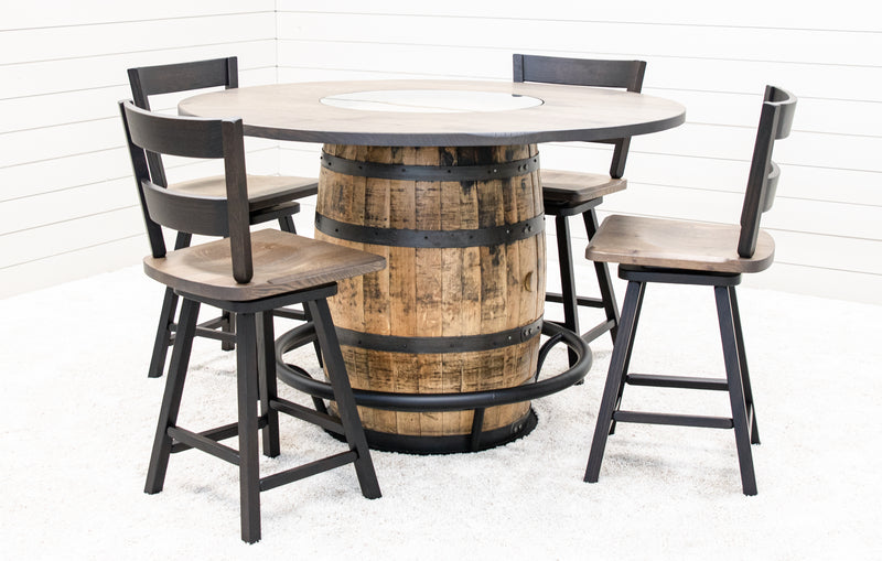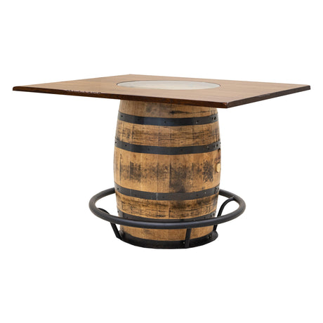 The Round Whiskey Single Barrel Table features a beautiful, repurposed whiskey barrel base and a solid hardwood top, completed with a center glass insert. The unique rustic-style pub table includes a black metal food rail. The hardwood top can be ordered in your choice of wood type and color. For more information, contact a member of our team.
