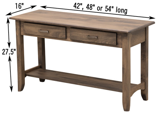 The Austin Open Sofa Table features tapered legs and a smooth top with rounded corners. Amish made by craftsman in Ohio, the sofa table is built with solid wood and made to be sturdy and long lasting. Order this piece in your choice of wood and color. For more information, contact a member of our team at Upstate Amish Furniture Gallery.