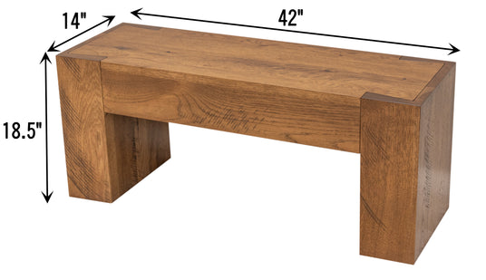 The Oxford Bench by Upstate Amish Furniture Gallery has a modern appearance with its square, chunky legs and dovetailed detail in each top corner. Use this bench as an accent piece to your entryway or living room area. This solid wood bench is built from scratch by Amish craftsmen in Ohio and is made to order in your choice of wood, color and size to accommodate the space you. Contact us for more information.