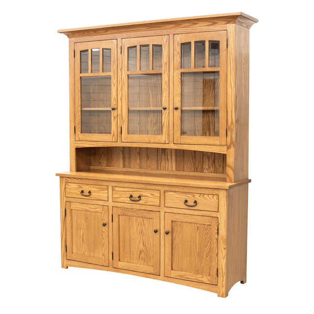 The large Century Mission Hutch is crafted with solid wood and features a shiplap back. The hutch top includes beveled glass in the doors as well as wood framed, glass shelves with plate grooves. The top also includes can lights. This Amish made China cabinet can be ordered in your choice of wood and color. Contact a member of our team for more details.Â