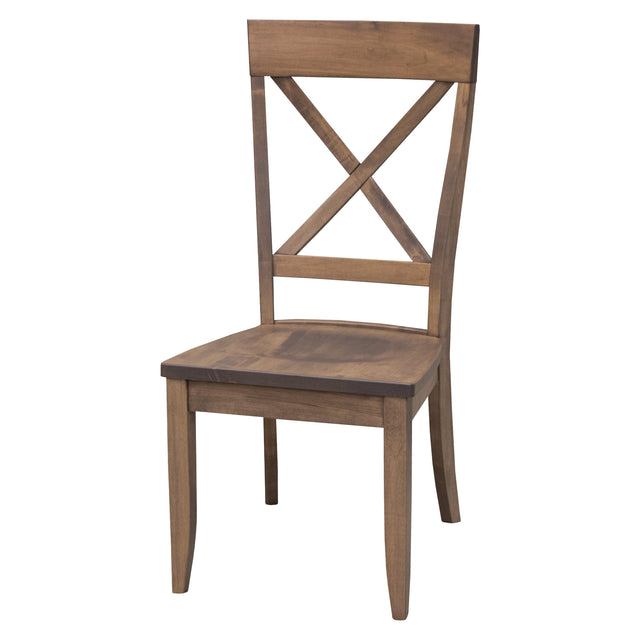 The Portland Side Dining Chair features a sleek X back design and a rounded top board. The Amish-made dining chair is crafted with solid wood, constructed to be durable and long-lasting. The chair can be custom ordered in any wood species and color. Contact a member of our team for more details.