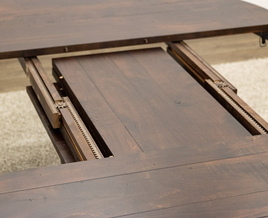 The Alberta Pub Table features folding leaves that store inside the table. Every dining table is available in your choice of wood type and stain color.
