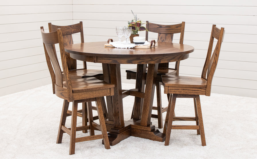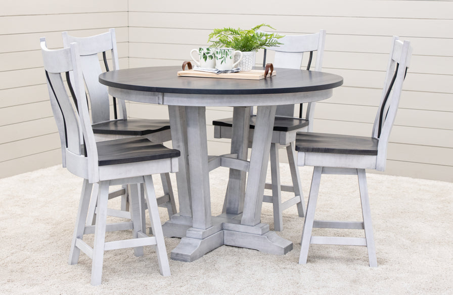 This Alberta Round Extending Pub Table has a 1" thick Sawmill Top with manually worn edges and an optional 12" leaf that opens up and folds in half for storage. The Amish pub table's sturdy construction ensures durability that can stand up to messes, spills, and everyday use. For more details, contact our team at Upstate Amish Furniture Gallery.