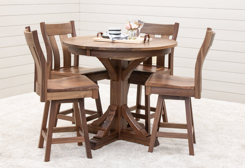 The Newport Round Pub Table is handcrafted with solid wood by Amish artisans in Ohio. The sturdy, well-built table is a stylish addition to any dining space. It can be ordered in your choice of wood and color. For more information, contact a member of our team.