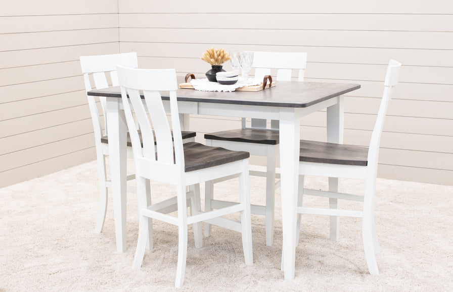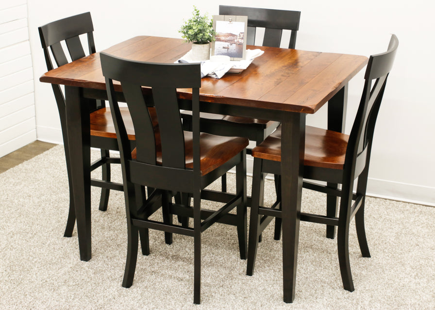 The Camden Shaker Pub Table is Amish-made, crafted with solid hardwood. The table features self-storing leaves and shaker style legs. The planks run lengthwise on a table without leaves. The planks run widthwise on a table with leaves. For more information, contact a member of our team.