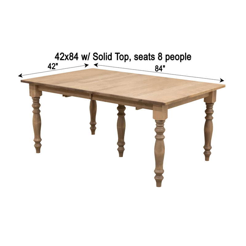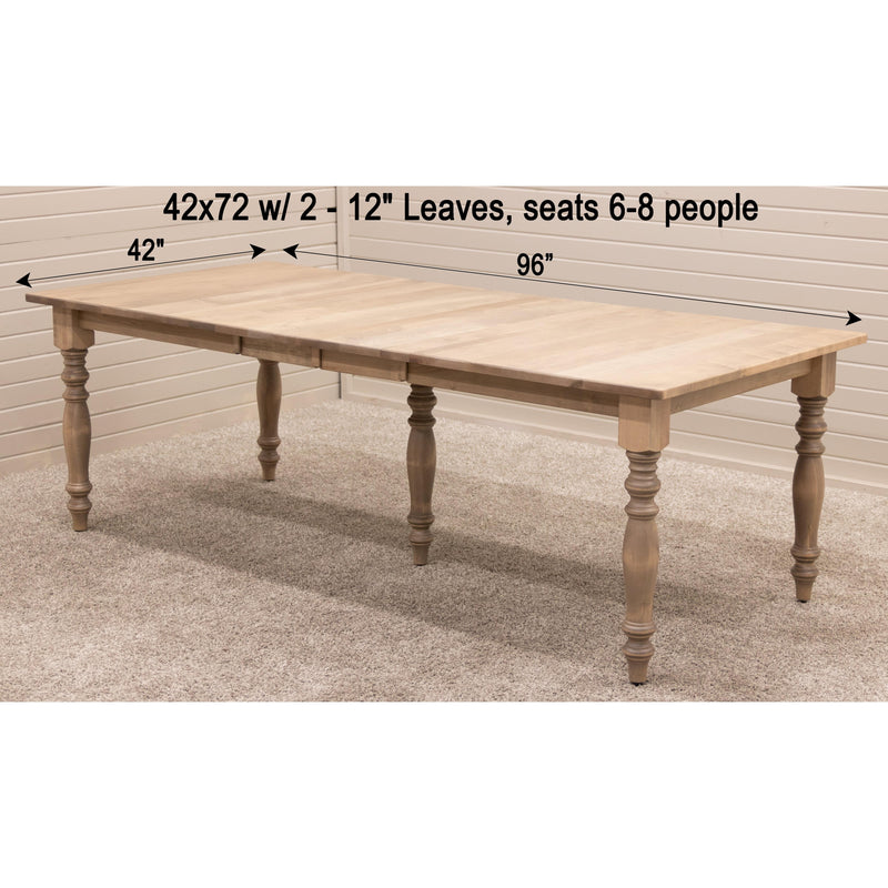 The Modern Farm Leg Dining Table features modern-style turned legs and self-storing leaves. The Amish-made table is built with solid hardwood and gives a clean, fresh look to any dining space. The planks run lengthwise on a table without leaves. The planks run widthwise on a table with leaves. For more details, contact a member of our team.
