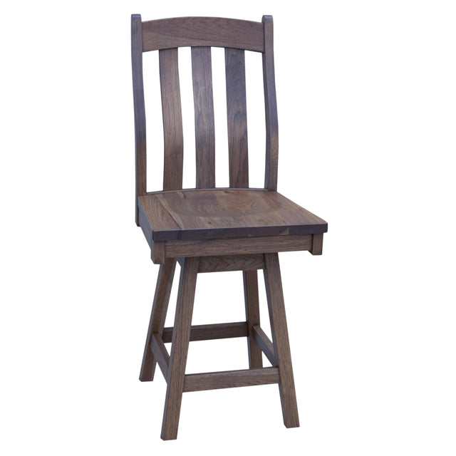 The Fostoria Swivel Bar Stool features a slatted back, steamed and bent for maximum comfort and support. The Amish-made bar stool is carefully crafted to be durable and long lasting. Barstools are standard at either 24” or 30” high at the seat. There should be a 12” drop from a counter to the seat height. Each bar stool can be ordered in any wood or color. Contact a member of our team for more information.