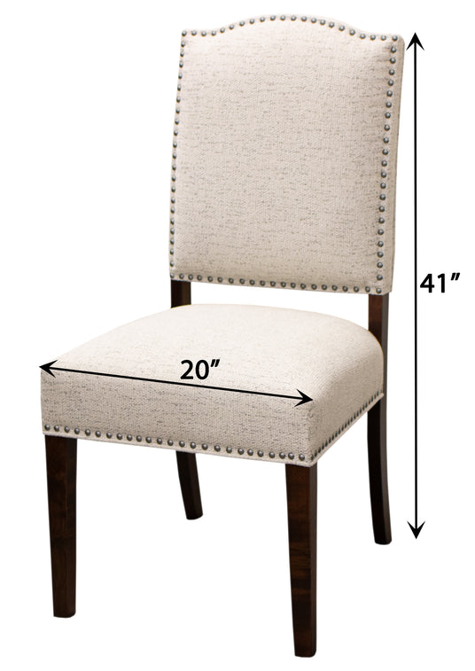 The Emerson Upholstered Side Dining Chair is made with a curved top board and nail head trim, adding style and comfort to your dining space. The Amish-crafted chair can be ordered in your choice of fabric/faux leather color and wood base. When purchasing a dining table and chair set, this wood base will automatically match the dining table you purchased. For more details, contact a member of our team.
