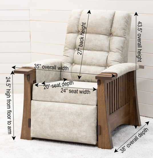 The Craftsman Mission Wallhugger Recliner features wide, comfortable wood arms with covers. The push back style recliner also has a flip-out foot rest. Order this solid wood piece in your choice of wood and fabric color. For more details, contact a member of our team at Upstate Amish Furniture Gallery.