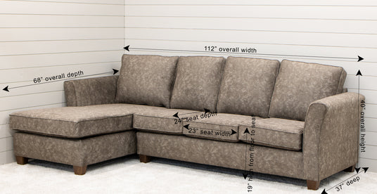 The Manhattan Stationary Sofa with Chaise is Amish-built in Ohio, crafted and upholstered by hand. The high quality, comfortable sofa features deep seats and flared arms. Order this piece in your choice of fabric color. For more details, contact a member of of our team at Upstate Amish Furniture Gallery.