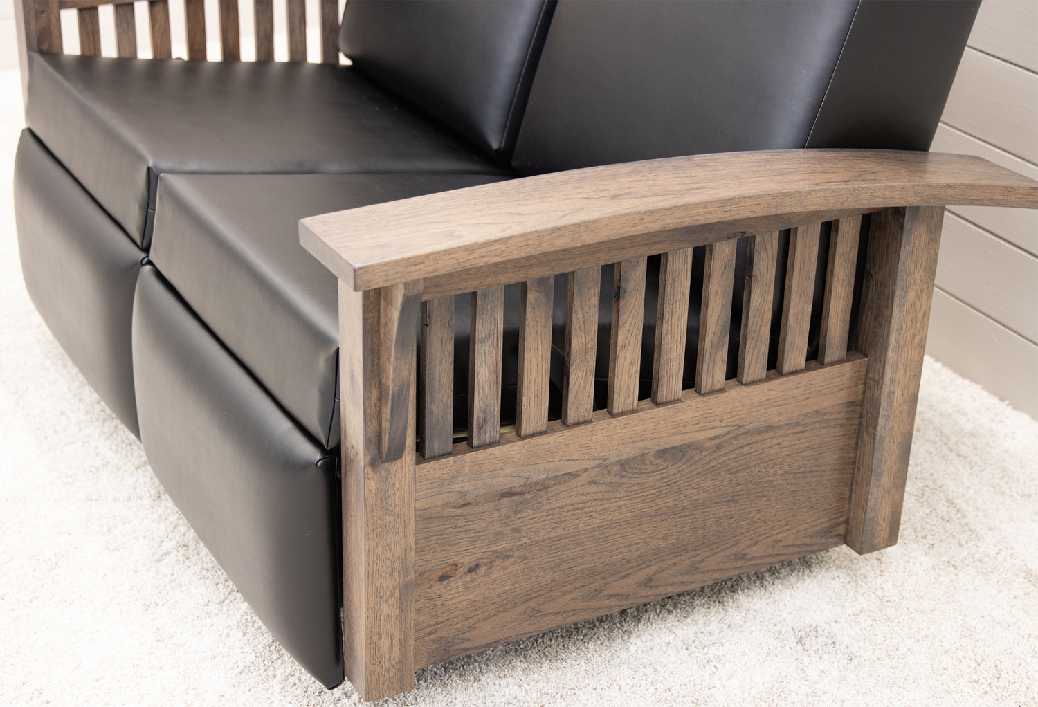 The Mission Reclining Loveseat is handcrafted by Amish artisans in Ohio and features solid wood arms. The loveseat is both gliding and reclining. Order this piece in your choice of wood and fabric color. For more details, contact a member of our team at Upstate Amish Furniture Gallery.