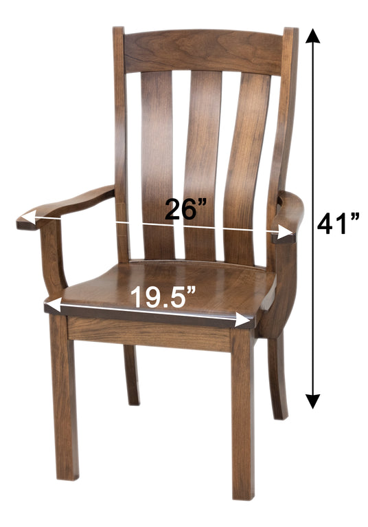 The Logan Arm Dining Chair features a steamed and bent back for comfort and support. The Amish-made dining chair is crafted with solid wood, constructed to be durable and long-lasting. The chair can be custom ordered in any wood species and color. Contact a member of our team for more details.