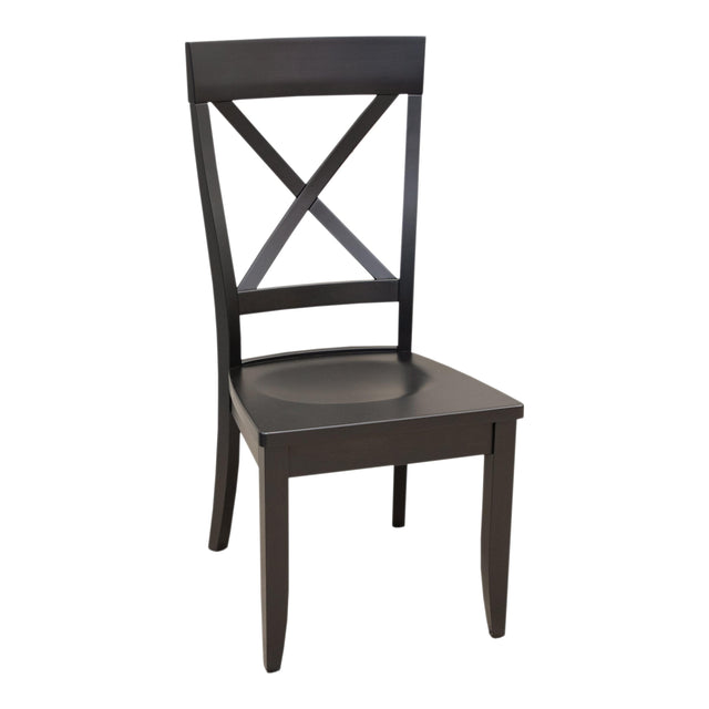 The Portland Side Dining Chair features a sleek X back design and a rounded top board. The Amish-made dining chair is crafted with solid wood, constructed to be durable and long-lasting. The chair can be custom ordered in any wood species and color. Contact a member of our team for more details.