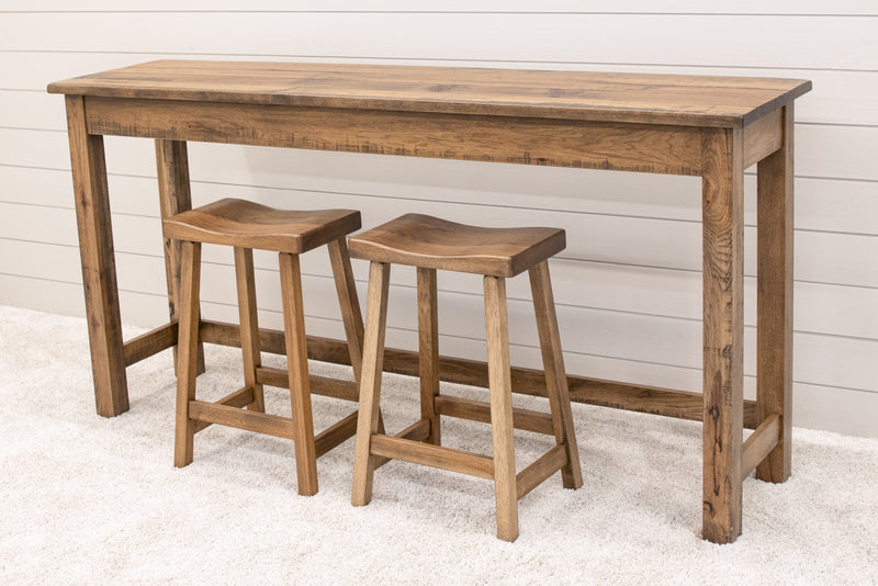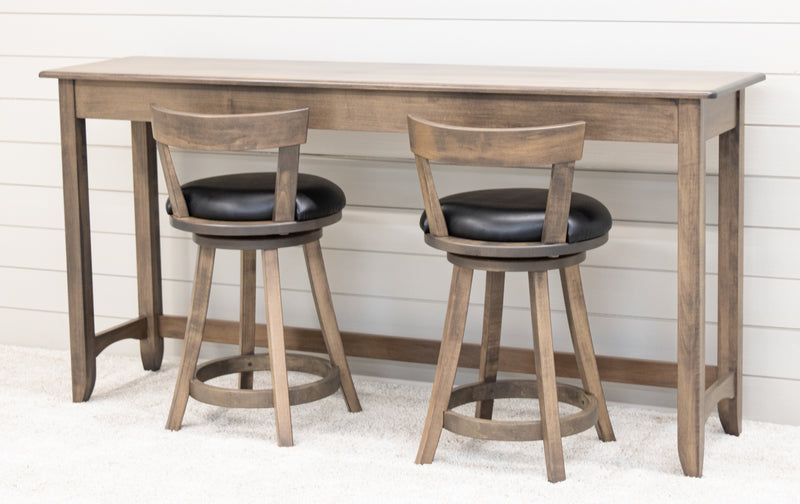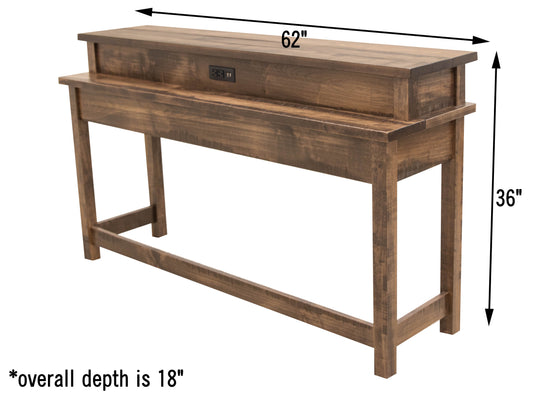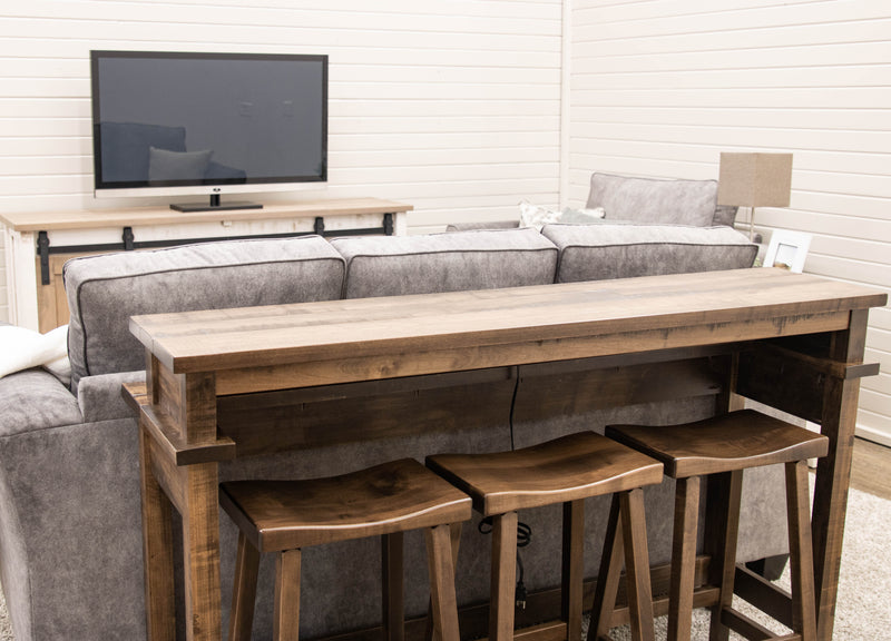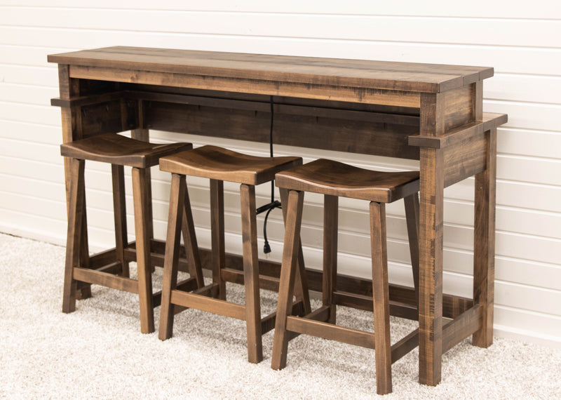 The Arcadia Sofa Bar Table is built with solid hardwood and features a outlet in the back and a distressed plank top. The Amish made sofa bar can be ordered in your choice of wood and color. For more details, contact a member of our team at Upstate Amish Furniture Gallery.