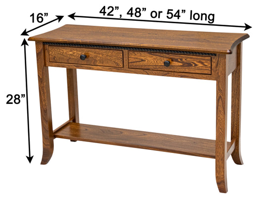 The Plymouth Open Sofa Table features a beveled top and black rope trim under the top. The Amish-made piece is handcrafted in Ohio and can be ordered in your choice of wood and color. For more details, contact a member of our team at the Upstate Amish Furniture Gallery.