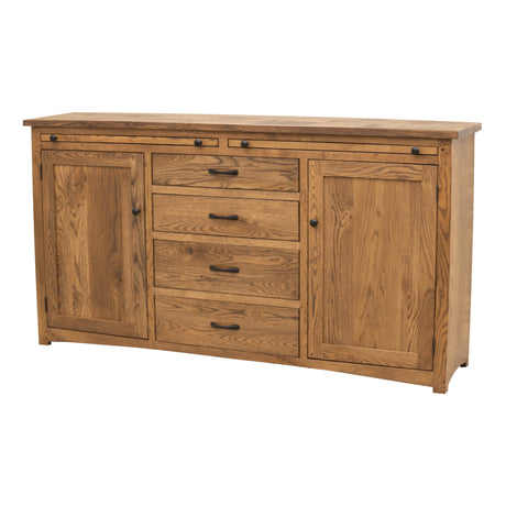 Our Carlisle Settler's Sideboard Cabinet is a larger option with four doors and four drawers. It also features two wide serving pullouts for plates of appetizers and desserts. The large surface of the top and drawers make highly figured woods a great option. Cherry, flamed birch, and elm wood would all have opportunity to display their unique wood grain patterns.