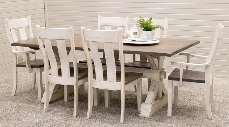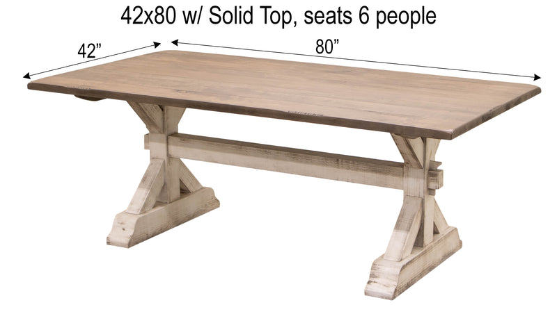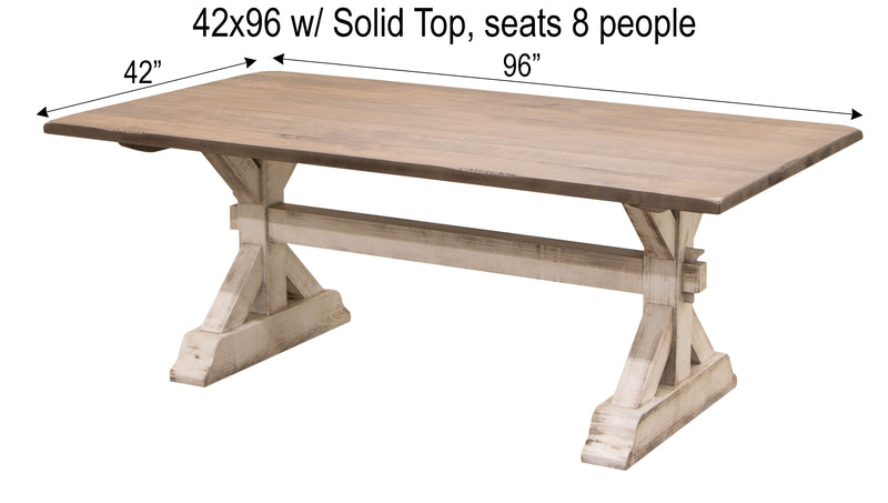 The Farmhouse Trestle Dining Table is crafted with solid hardwood and built to last. The farmhouse-style table is a perfect addition to any dining the space. It can be ordered in your choice of wood and color. For more information, contact a member of our team.
