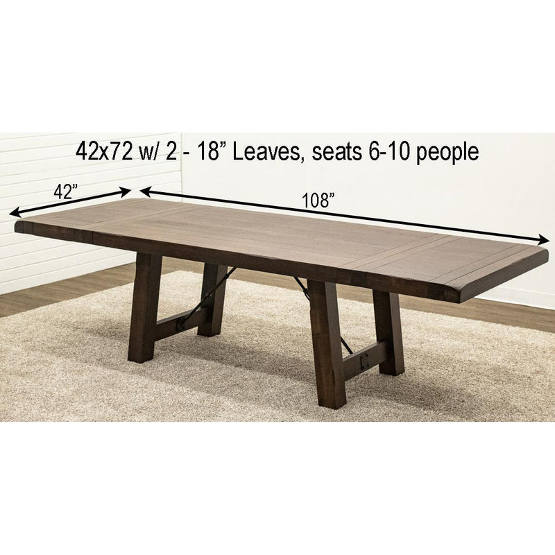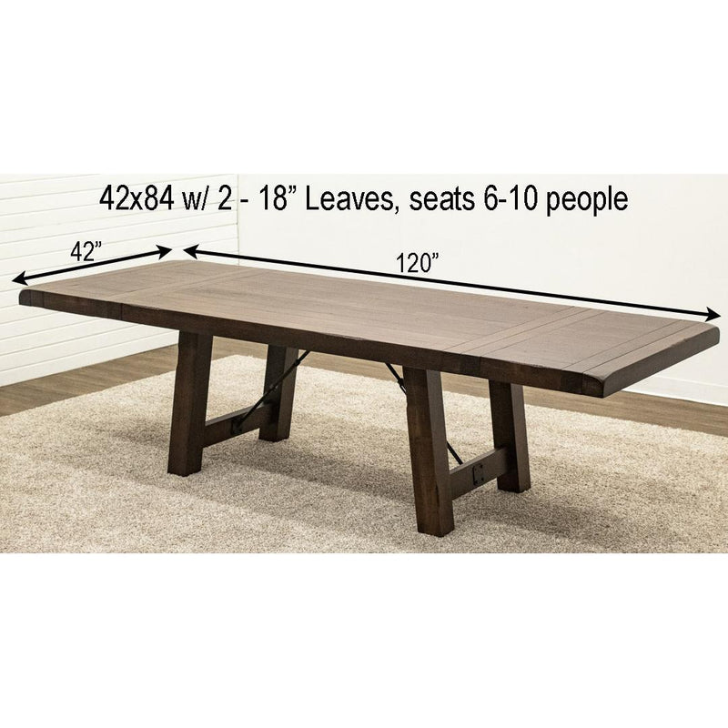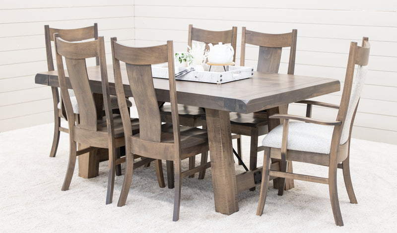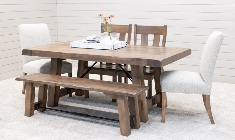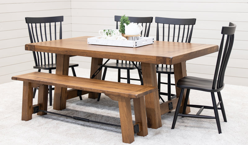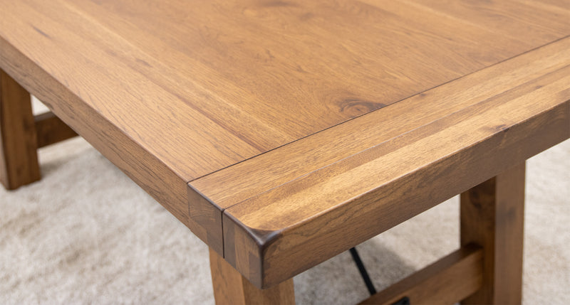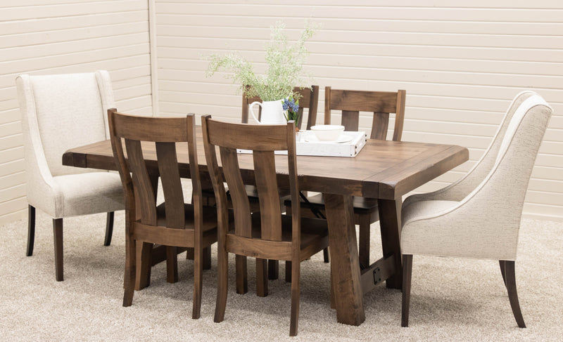 The Settler's Trestle Dining Table features breadboard ends to fit leaves for an extendable table. Every dining table is available in your choice of wood type and stain color.