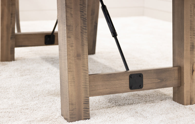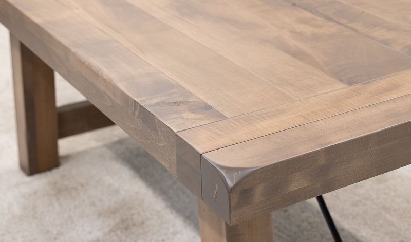 The Settler's Trestle Extending Dining Table features a 2.5" solid wood top and breadboard ends. The Amish made table can be ordered in your choice of wood and color. For more information, contact a member of our team.