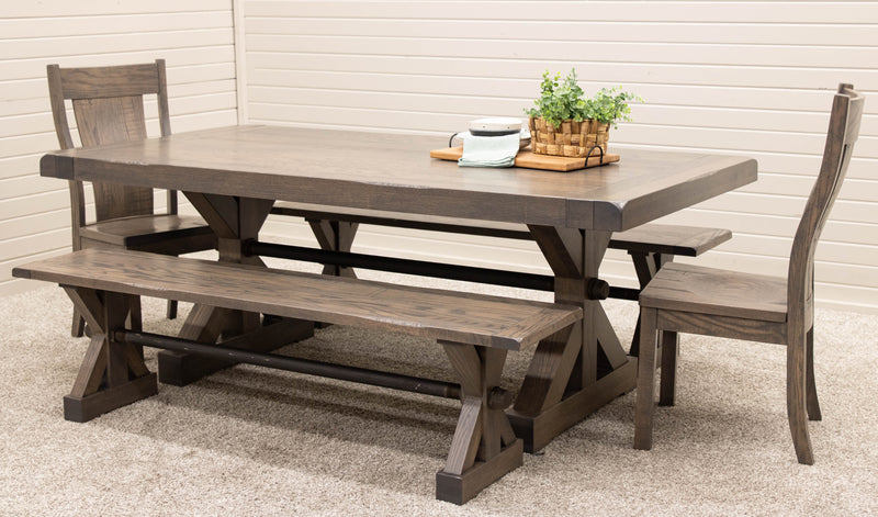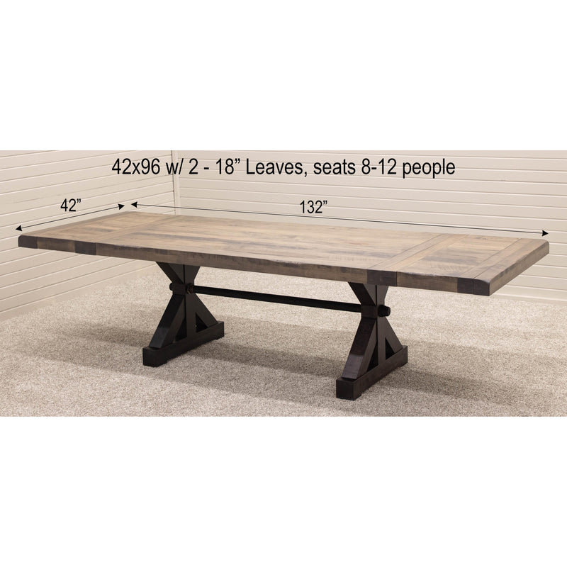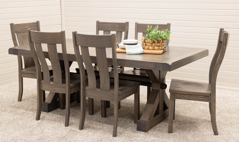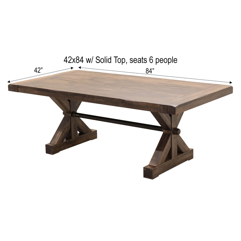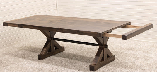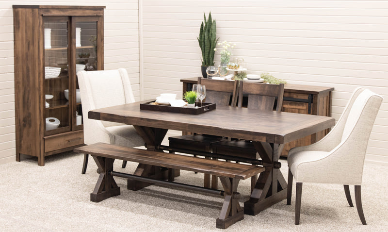 The Auburn Dining Table features breadboard ends to fit leaves for an extendable table. Every dining table is available in your choice of wood type and stain color.