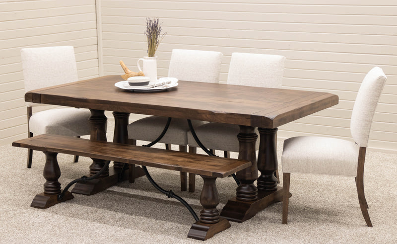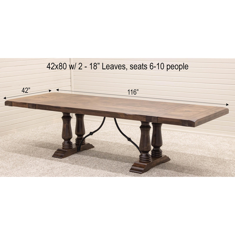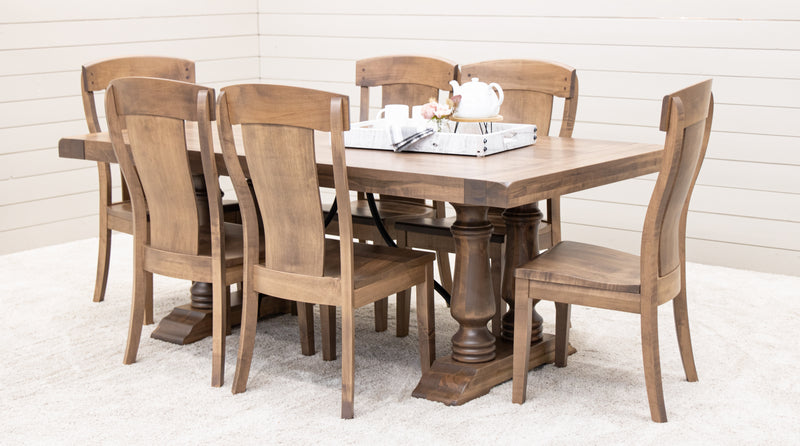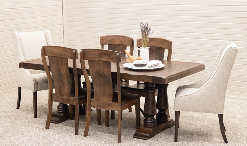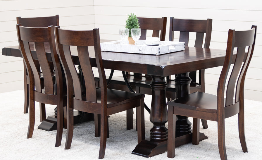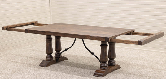 The Alexandria Dining Table features breadboard ends to fit leaves for an extendable table. Every dining table is available in your choice of wood type and stain color.