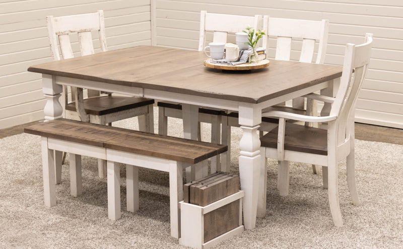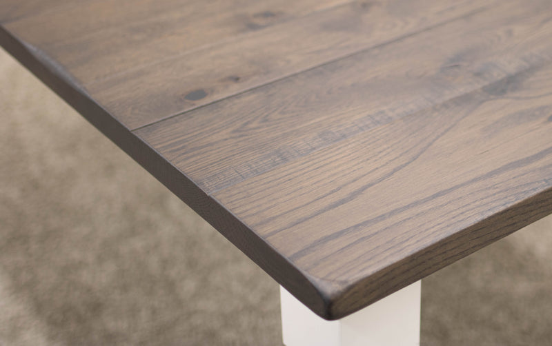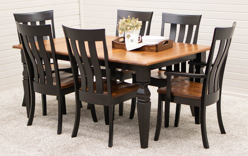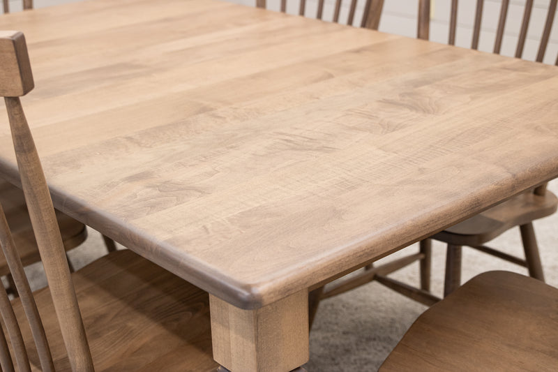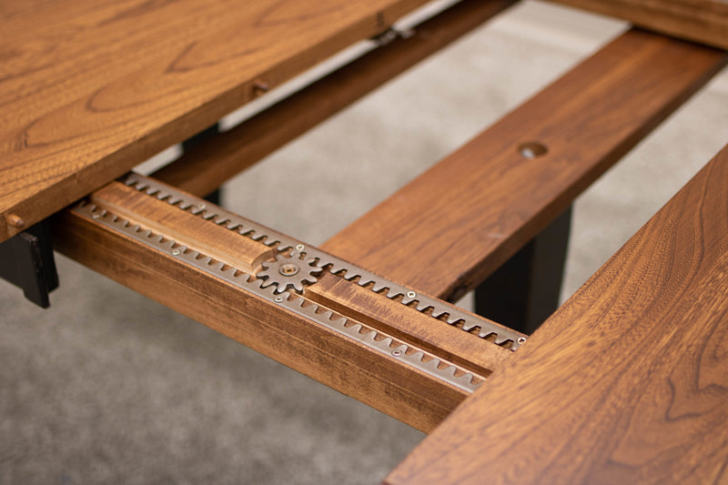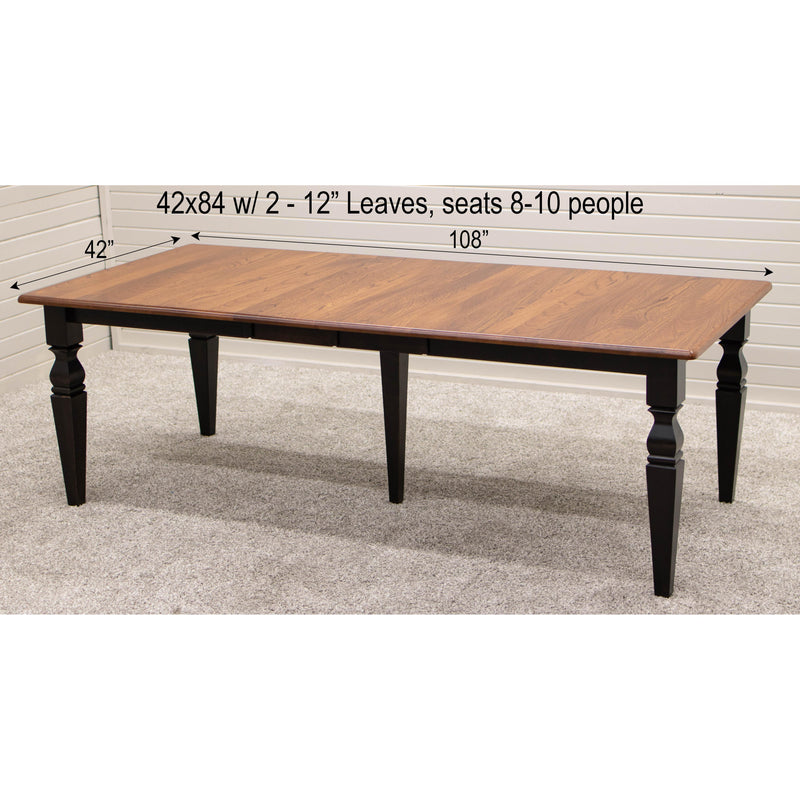 The Classic Turned Cam Leg Dining Table features leaves that store inside the table. Every dining table is available in your choice of wood type and stain color.