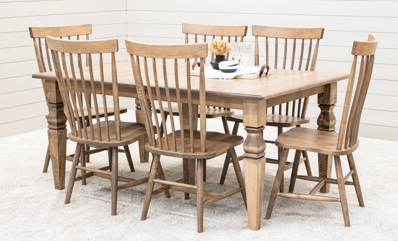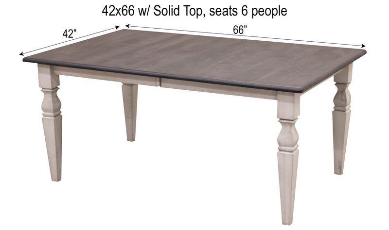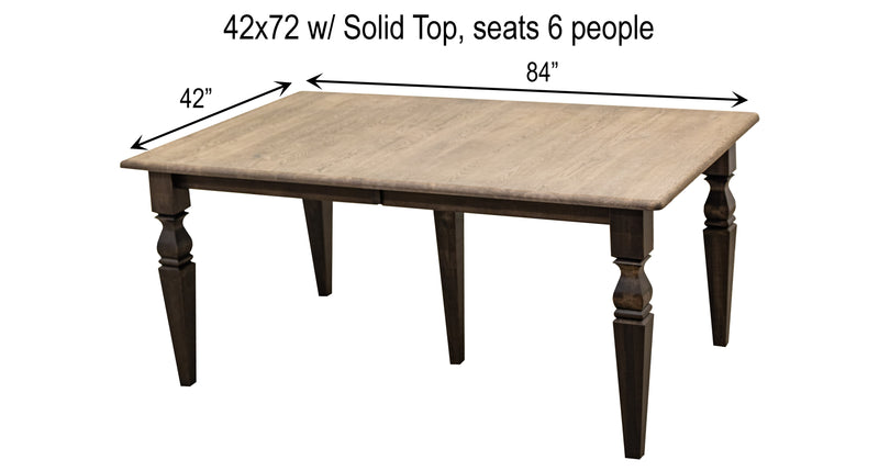 The Amish-made Classic Turned Leg Dining Table is made with solid wood and features stylish turned legs. The grain runs lengthwise on a table without leaves The grain runs widthwise on a table with leaves. For more details, contact a member of our team.