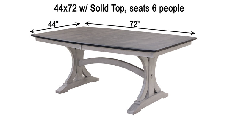 The Napoleon Trestle Dining Table is constructed with solid wood, built to last. The large, formal style dining table is Amish-made in Ohio. The grain runs lengthwise on a table without leaves. The grain runs widthwise on a table with leaves. For more details, contact a member of our team.