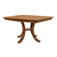 The Carlisle Single Pedestal Dining Table features leaves that store inside the table. Every dining table is available in your choice of wood type and stain color.