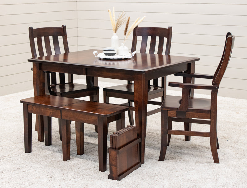 The Lakeland Shaker Dining Table features leaves that store inside the table. Every dining table is available in your choice of wood type and stain color.