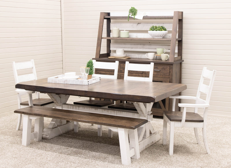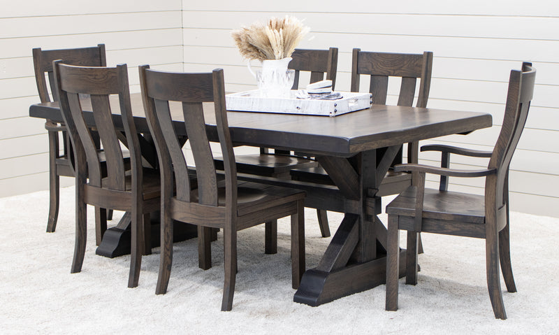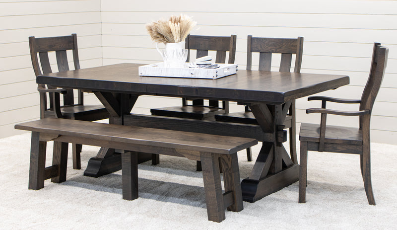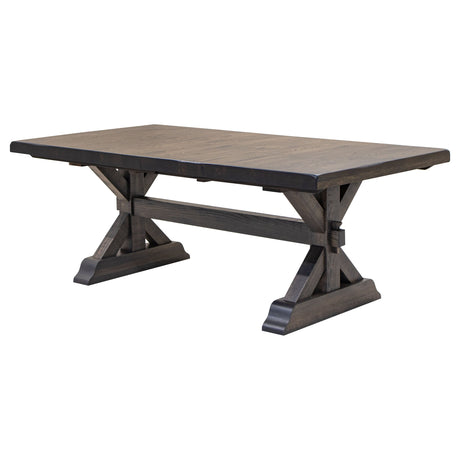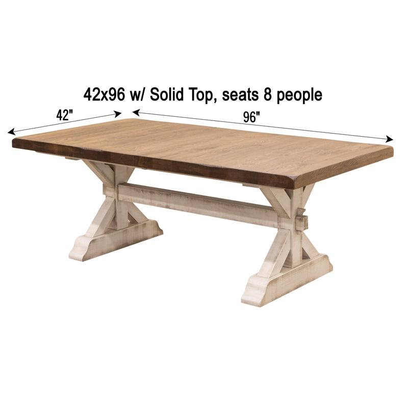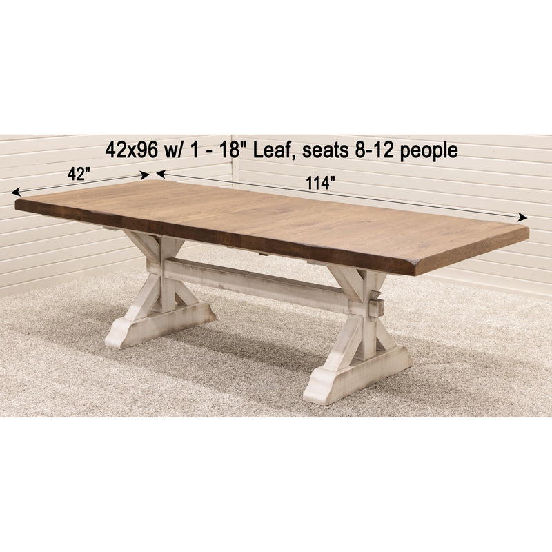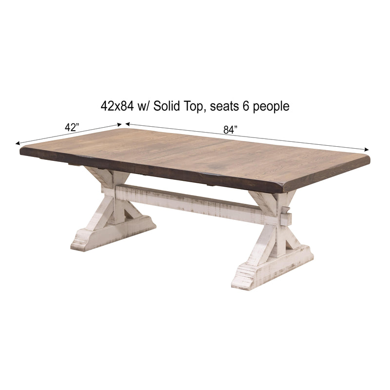 The Farmhouse Trestle Dining Table features a built down top and self-storing leaves. Every dining table is available in your choice of wood type and stain color.