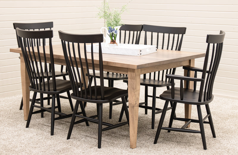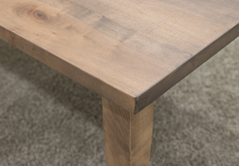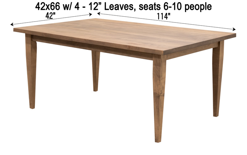 The Shaker Mid Century Dining Table is a beautiful, modernized table style, based off of the Classic Shaker Leg Table. This Amish made table is built with solid hardwood, made to last. The grain runs lengthwise on a table without leaves. The grain runs widthwise on a table with leaves. For more details, contact a member of our team.