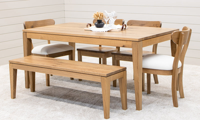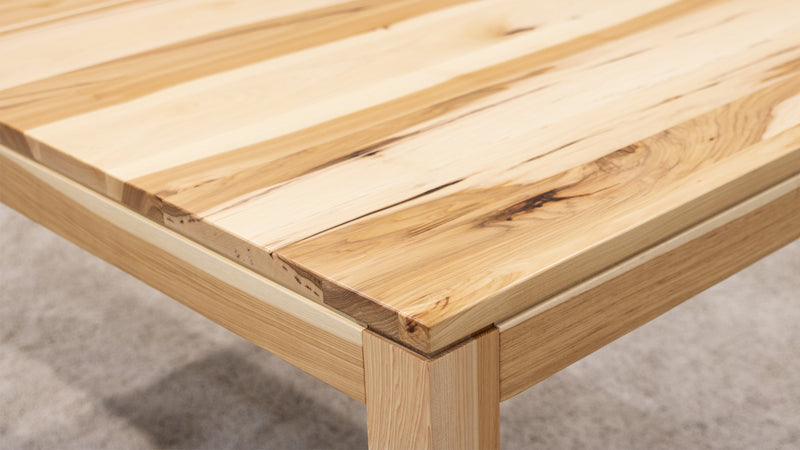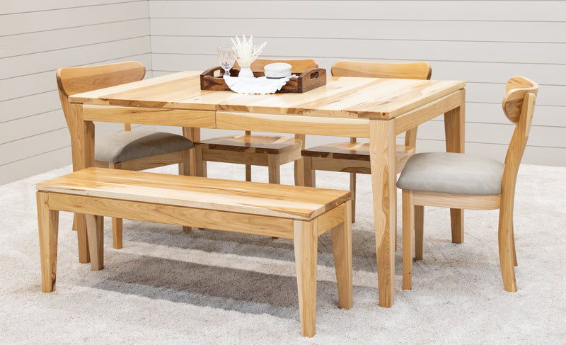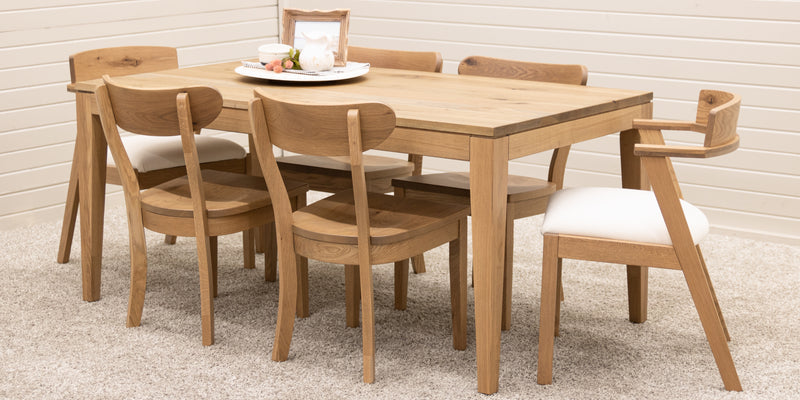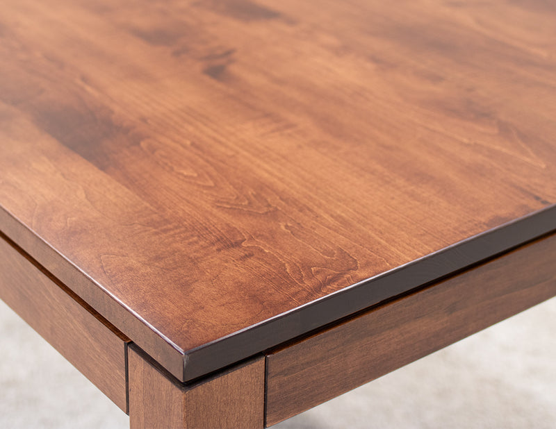 The Monroe Mid Century Dining Table features leaves that store inside the table. Every dining table is available in your choice of wood type and stain color.