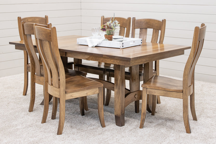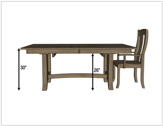 The Shaker Hill Dining Table features a rectangle solid wood top and a trestle base. The Amish made table is a sturdy and well crafted piece with gear slides and self-storing leaves. The grain runs lengthwise on a table without leaves. The grain runs widthwise on a table with leaves. This table can be ordered in your choice of wood and color. For more details, contact a member of our team.