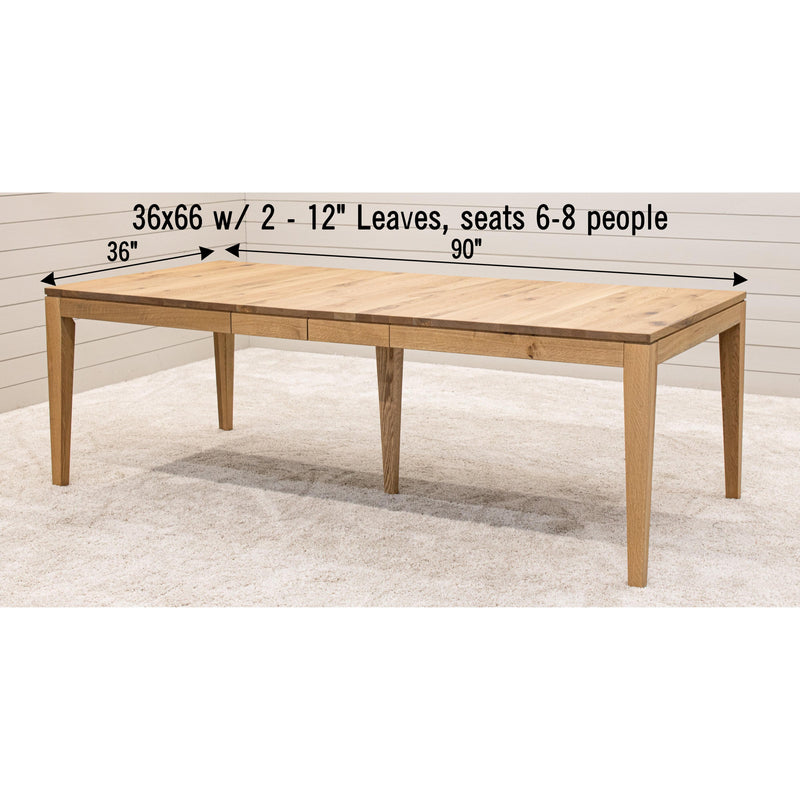 The Monroe Mid Century Dining Table features leaves that store inside the table. Every dining table is available in your choice of wood type and stain color.