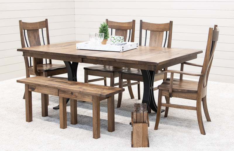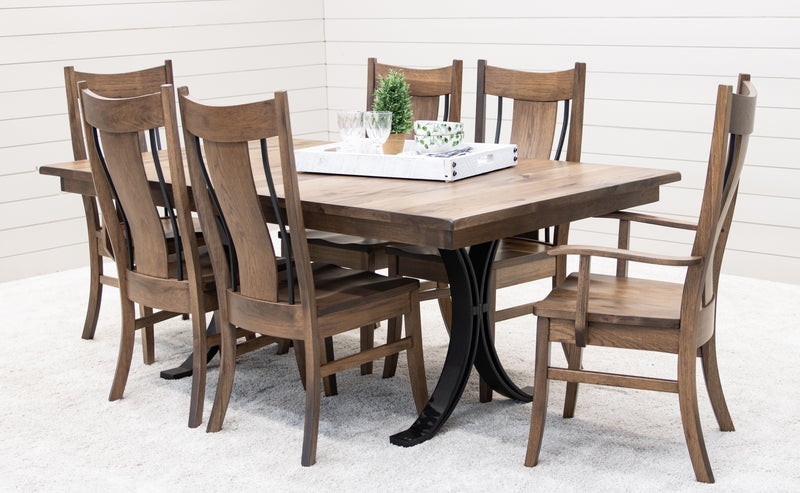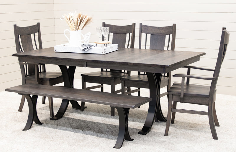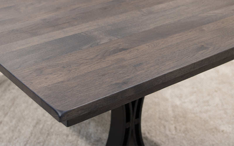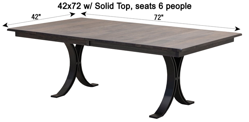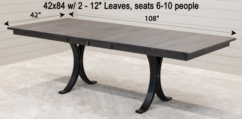 The Eclipse Dining Table features a black metal base and leaves that store inside the table. Every dining table is available in your choice of wood type and stain color.