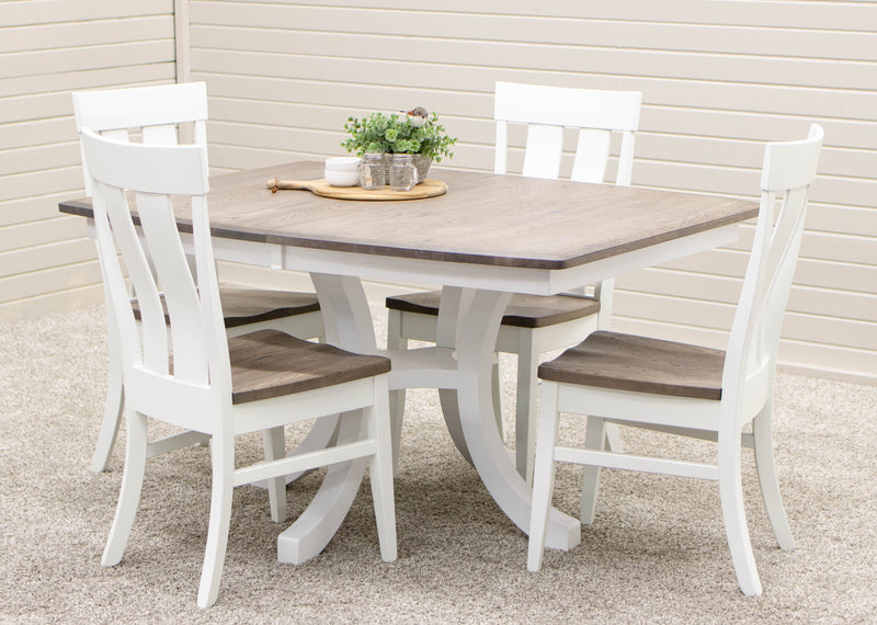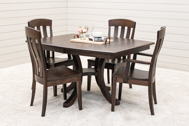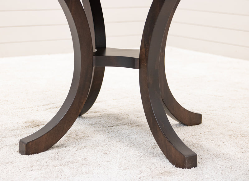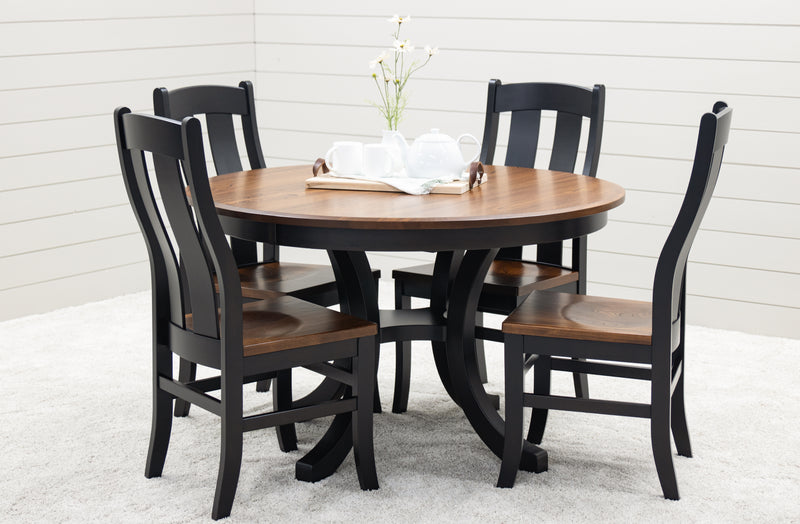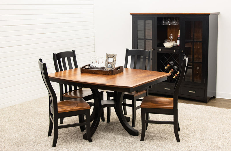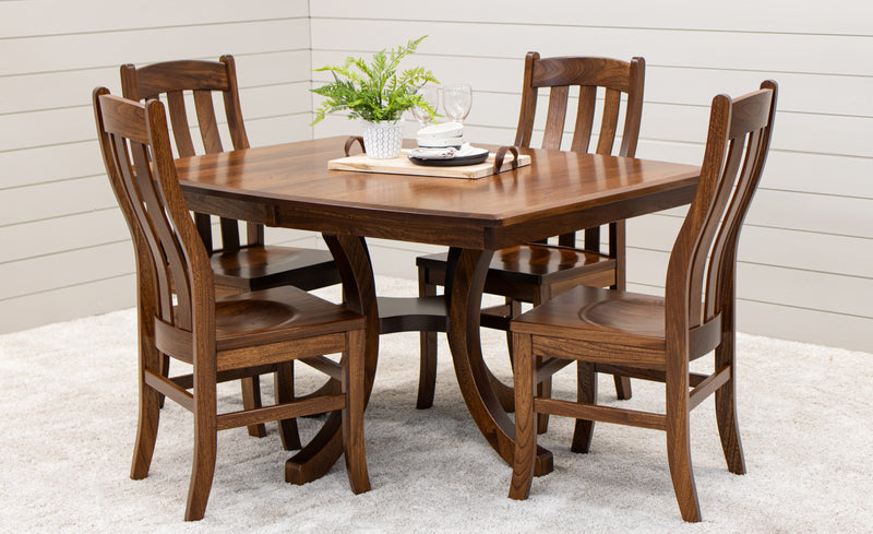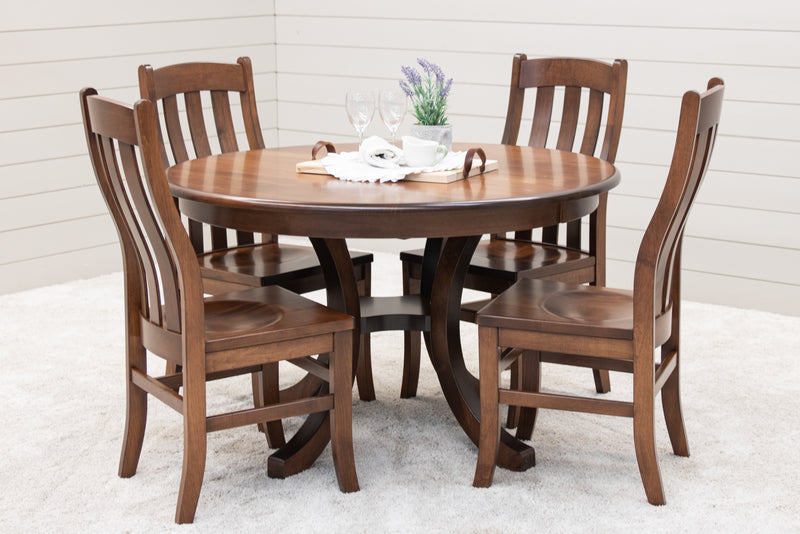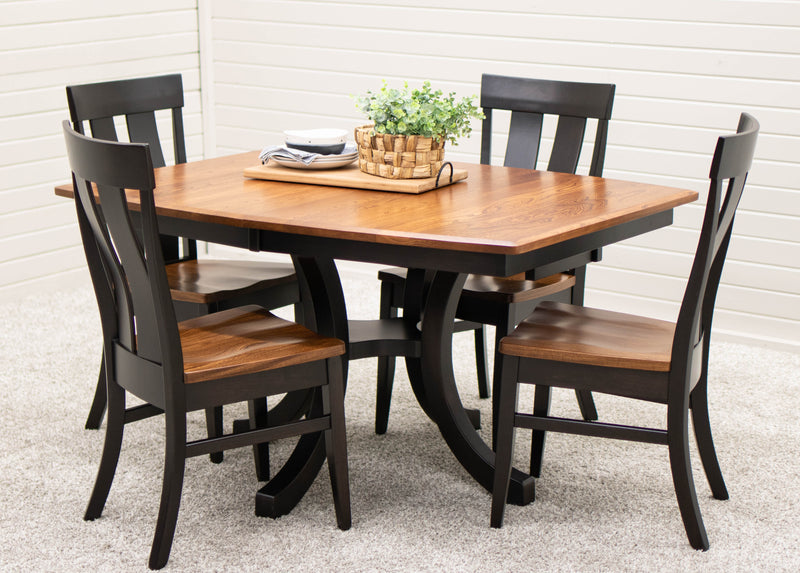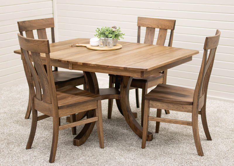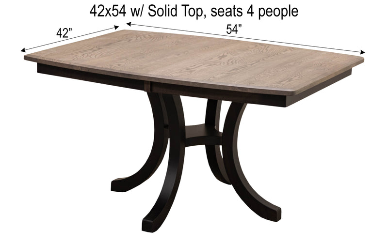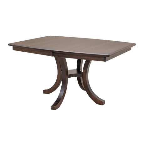 The Carlisle Single Pedestal Dining Table features a boat shaped top and a large bevel edge. The solid wood dining table is Amish-made in Ohio. The grain runs lengthwise on a table without leaves. The grain runs widthwise on a table with leaves. The table can be ordered in your choice of wood and color. Contact a member of our team for more details.