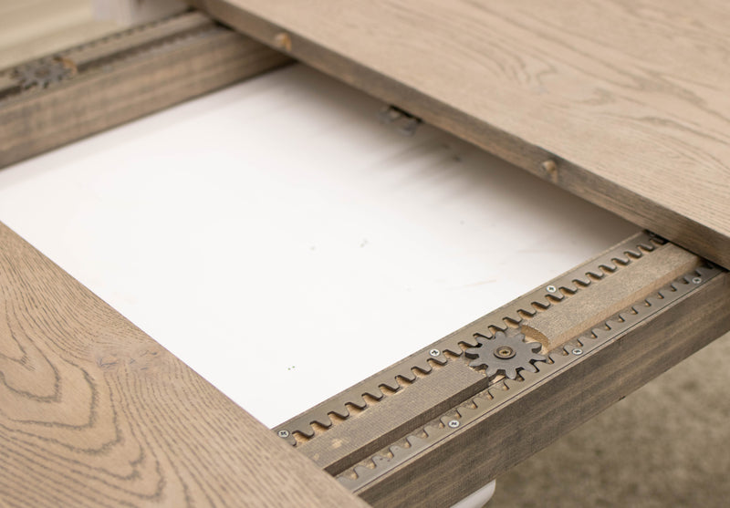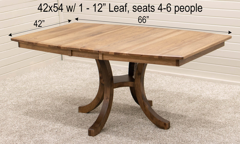 The Carlisle Single Pedestal Dining Table features leaves that store inside the table. Every dining table is available in your choice of wood type and stain color.