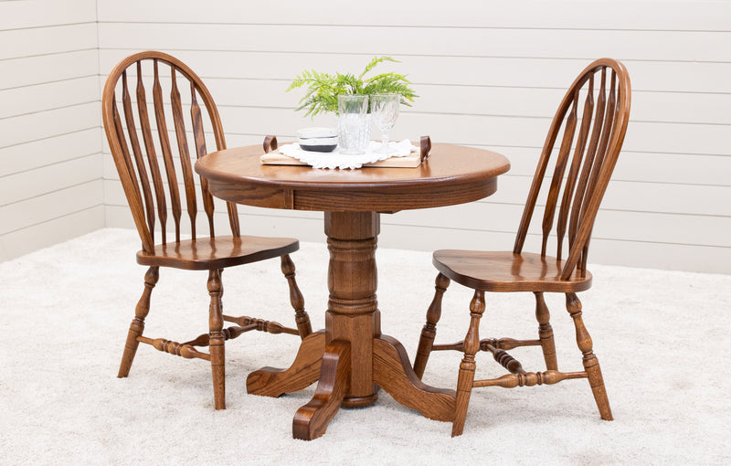The Traditional Round Dining Table features a folding leaf that stores inside the table. Every dining table is available in your choice of wood type and stain color.