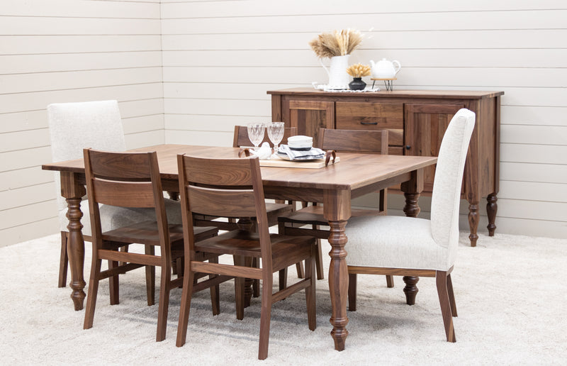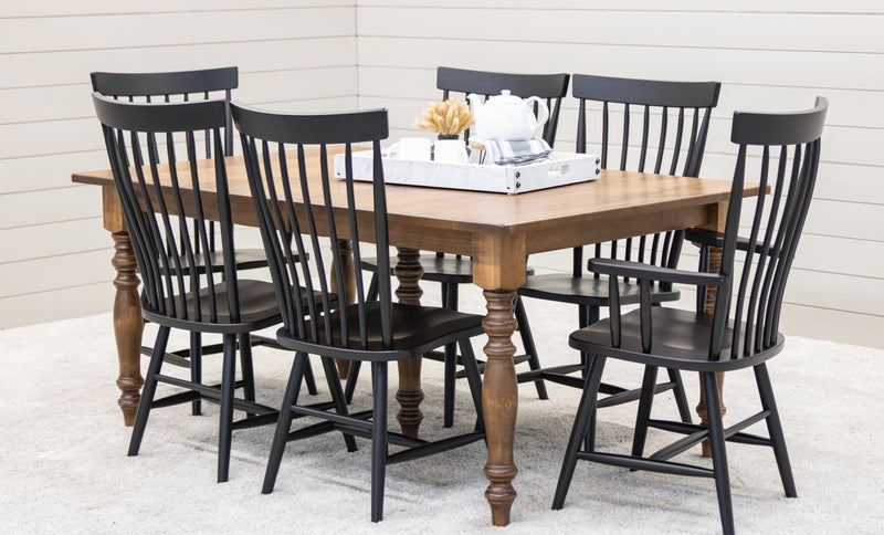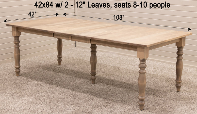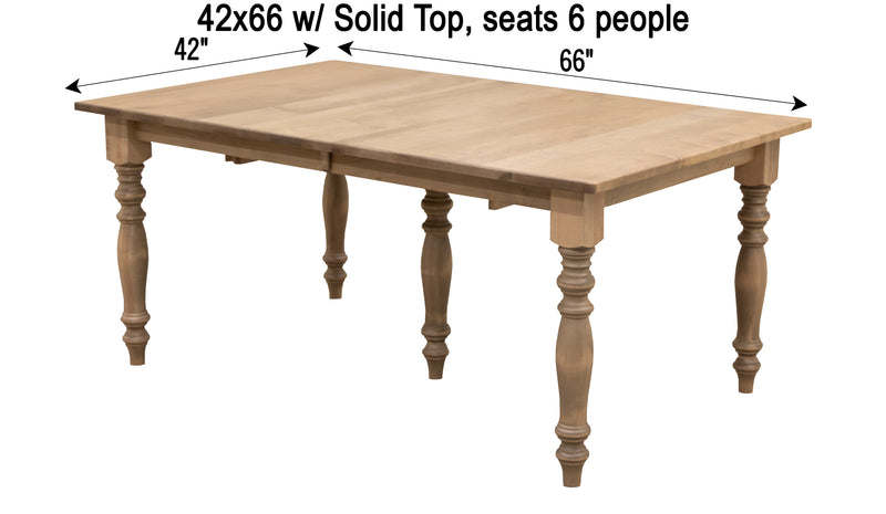 The Modern Farm Leg Dining Table features modern-style turned legs and self-storing leaves. The Amish-made table is built with solid hardwood and gives a clean, fresh look to any dining space. The planks run lengthwise on a table without leaves. The planks run widthwise on a table with leaves. For more details, contact a member of our team.