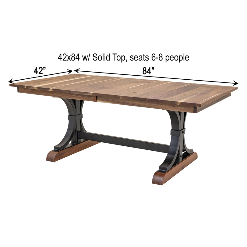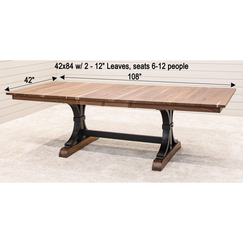 The Rockford Extending Dining Table features a Smooth, Solid Hardwood Top with a round over edge, along with a black metal base. This Amish made dining table features Self Storing Leaves - Planks run widthwise and extend easily with Gear Slides, and with no leaves - Planks run lengthwise. The top is crafted from thick and reliable solid, hardwood for stability, making it an ideal choice for hosting gatherings or family meals. For more information, contact us at Upstate Amish Furniture Gallery.