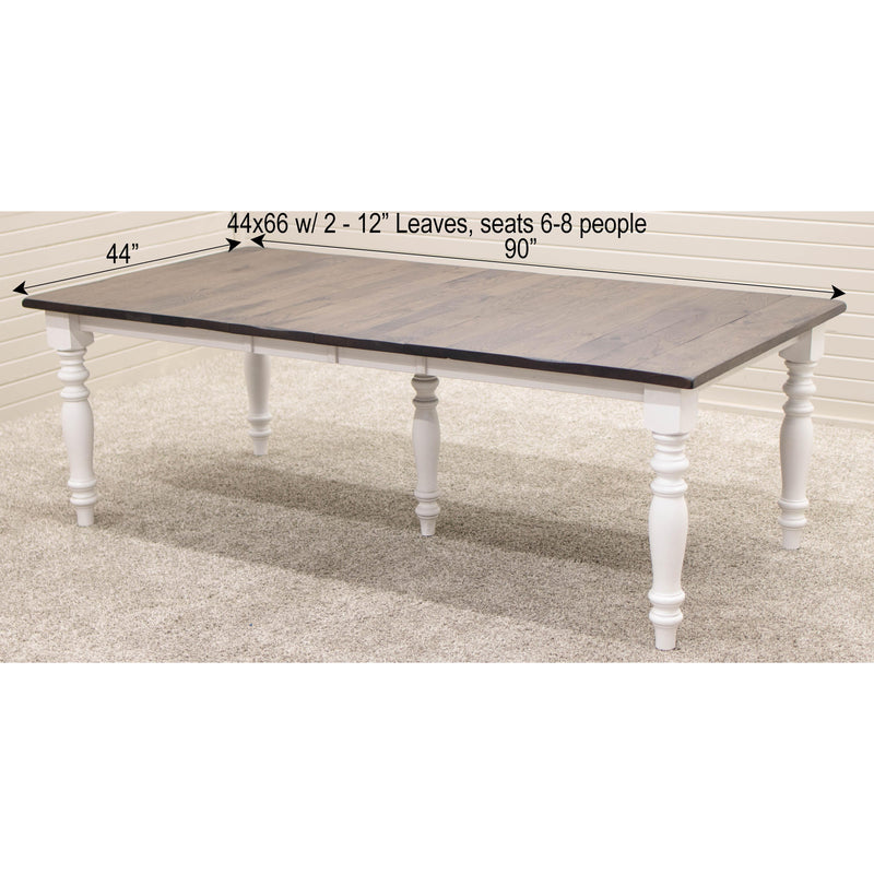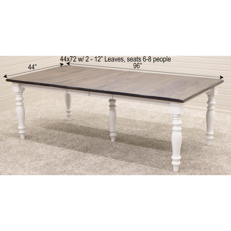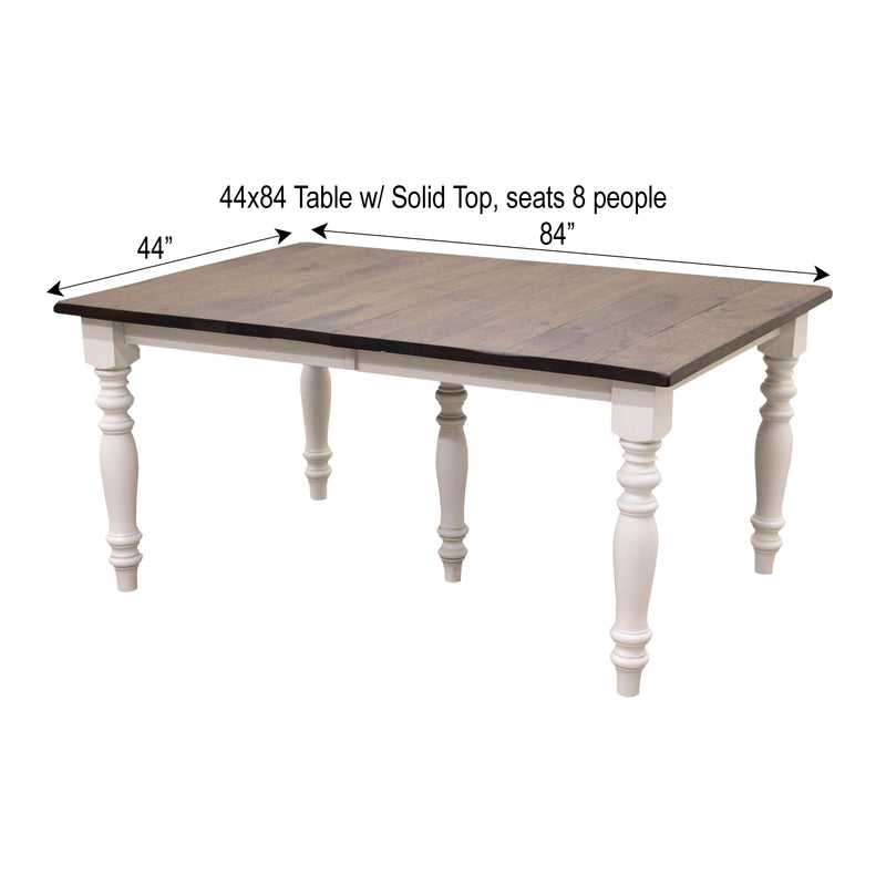 The Settler's Farm Leg Dining Table is built with solid hardwood and features stylish turned legs. The planks run lengthwise on a table without leaves. The planks run widthwise on a table with leaves. The Amish made table can be ordered in your choice of wood and color. For more details, contact a member of our team.