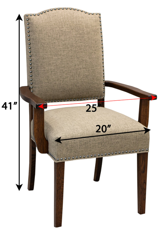 The Emerson Upholstered Arm Dining Chair is made with solid wood arms and shaker style legs. The curved top board and nail head trim add style and formality to your dining space. The Amish-crafted chair can be ordered in your choice of fabric/faux leather color and wood base. This style is also available with fabric arms (upon request). When purchasing a dining table and chair set, this wood base will automatically match the dining table you purchased. For more details, contact a member of our team.