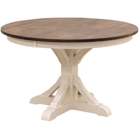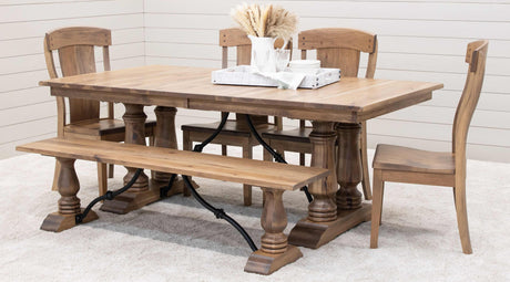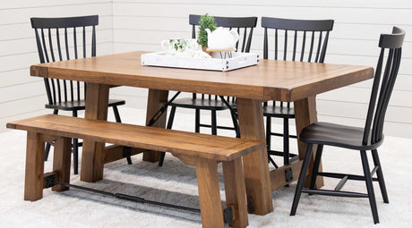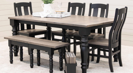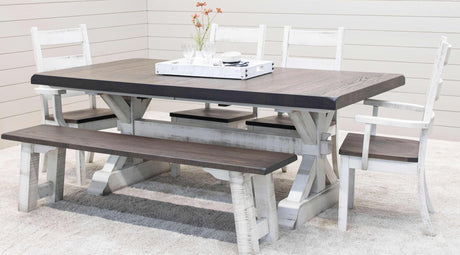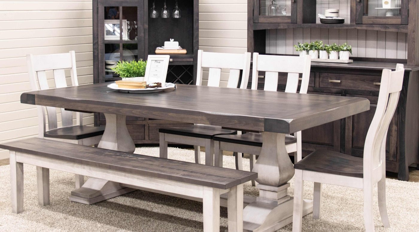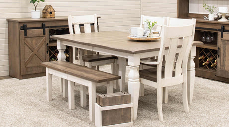 The Farmhouse Trestle dining table is a classic farm table to pair with a sturdy dining bench. Other farmhouse table sets with benches include the Turned Leg, Hillside, Rowan or Alexandria dining sets. Many farmhouse dining sets feature white painted bases with wood-stained tabletops. Color combinations like Maple wood with Glacier White paint and Rustic White Oak wood with Stone Brown stain add instant farmhouse style.