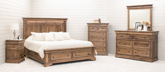A farmhouse king bedroom set often includes the bed, two nightstands, a dresser, chest and armoire or chiffonier. We offer many options for choosing a dresser in farmhouse styles. Some bed styles include a crown molding or other trim work that adds detail in the matching dresser. Other styles are easy to mix and match.