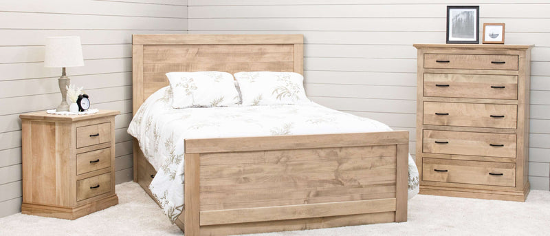 Furniture for farmhouse bedrooms has many options. If you already have wood floors or are looking for a complete bedroom set, Maple wood is a classic option. The smooth, subtle wood grain texture of Maple wood will not overwhelm your space or fight existing wood grains. Popular light stain colors on Maple wood include Cocoa Light, Sandy Point, Willowbend, and Sand.