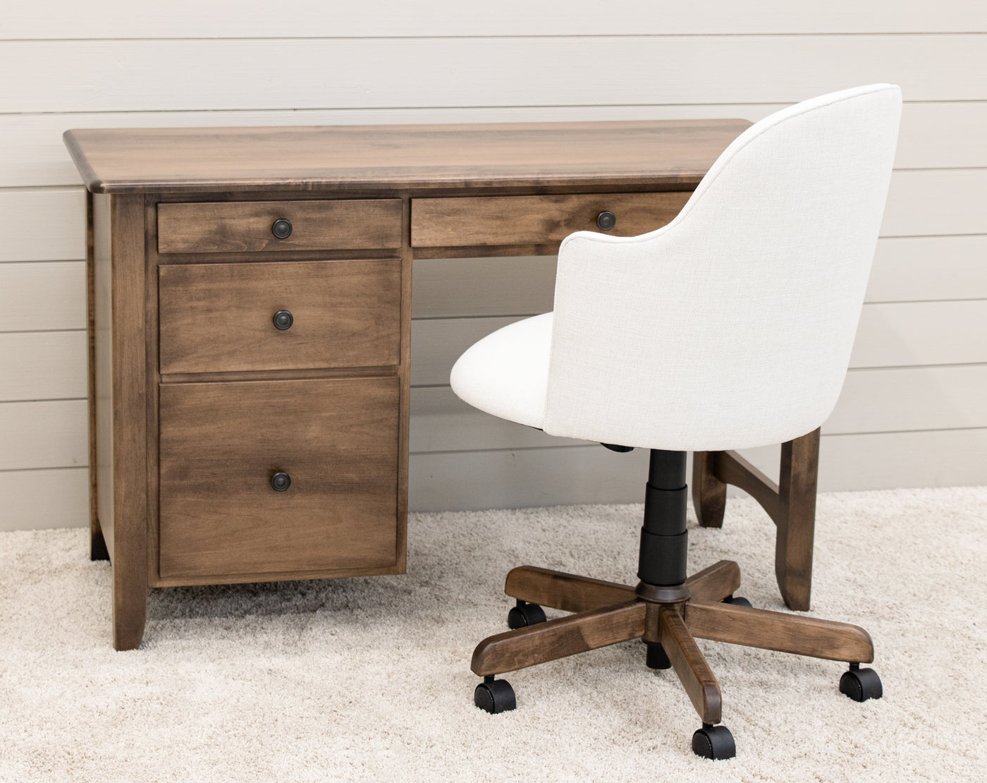 The Brooklyn Flat Wall Desk is built out of solid, hardwood and features flared legs. The desk provides endless storage, such as a file drawer at the bottom of each side and smaller drawers above it to store your essentials. This Amish made desk is customizable in your choice of size, layout, wood and color. Contact us at Upstate Amish Furniture Gallery for more details.